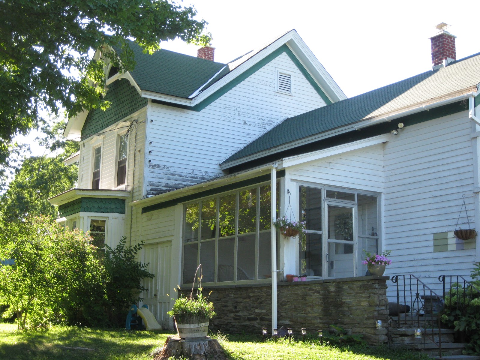 I've been planning on painting the farmhouse for a while now. When we first bought the house, the paint was in good shape, I just wasn't crazy about the colors (the green felt dated and the white-on-white main field and trim caused a lot of the Victorian detail to get lost). Now, the paint is really chipping off and the house looks a little, well, dumpy. The last time the house was painted was probably 20 years ago, so I'm hoping that with good preparation and quality paint, this paint job will last another 20.